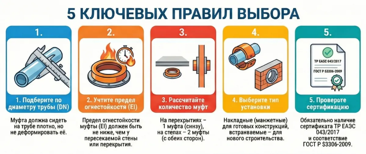 Выбирайте муфты, прошедшие испытания по ГОСТ Р 53306-2009 и имеющие сертификат ТР ЕАЭС 043/2017, например продукцию Baltica-01. Соблюдение правил монтажа, особенно использование металлического крепежа и правильное позиционирование, — гарантия того, что в критический момент система сработает штатно.