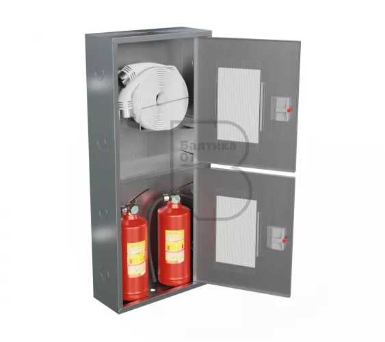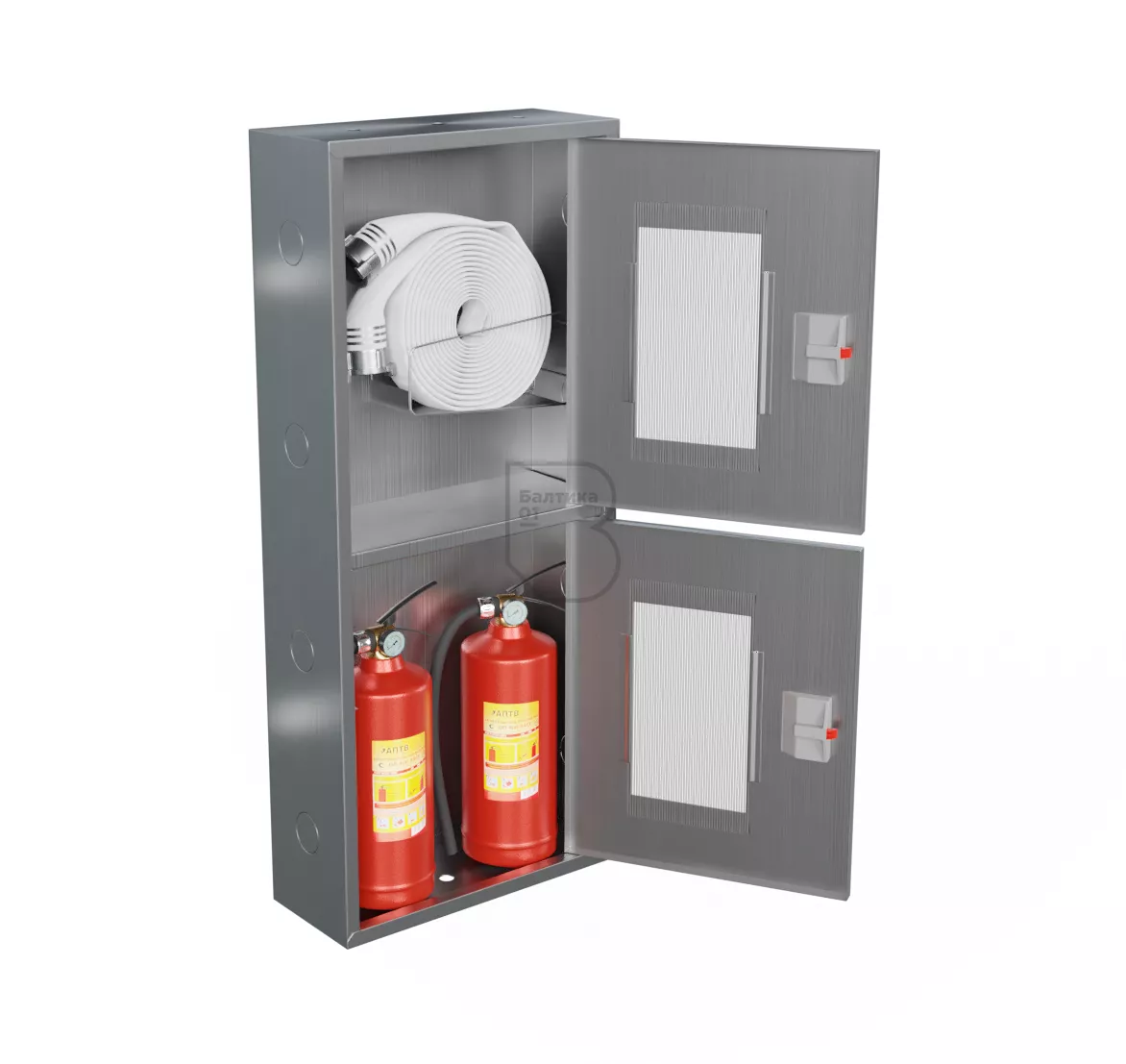 Дверцы пожарного шкафа открываются на 160 градусов. Имеют запорное устройство в виде пластиковой защелки.