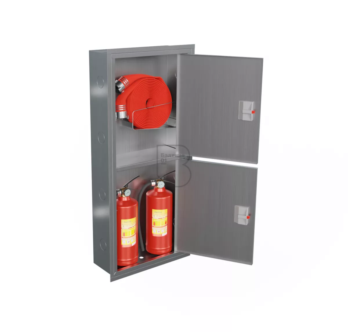 Дверцы пожарного шкафа открываются на 160 градусов. Имеют запорное устройство в виде пластиковой защелки.