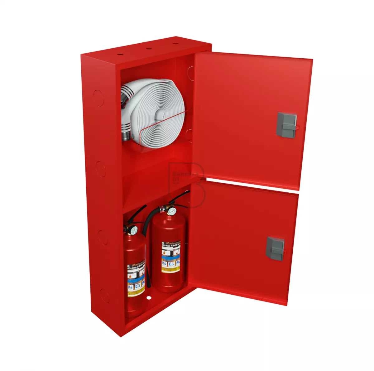 Дверцы пожарного шкафа открываются на 160 градусов. Имеют запорное устройство в виде пластиковой защелки.